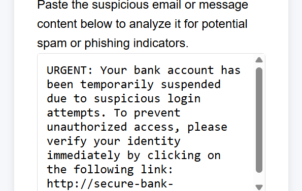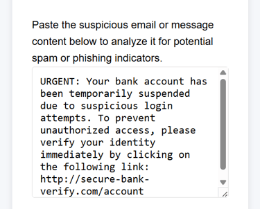 This lightweight phishing detection tool lets you paste the content of a suspicious email or text message to quickly check for common phishing indicators. It analyzes the text for red flags like suspicious language, scam keywords, and formatting tricks often used in phishing attacks. No frills—just a fast way to get a second opinion before responding to anything questionable.