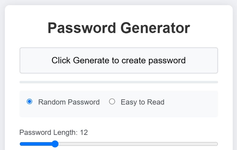 A secure password is your first line of defense against cyber threats. Our Password Generator tool creates strong, randomized passwords to help protect your accounts and sensitive data. With customizable options for length, character types (uppercase, lowercase, numbers, and special symbols), you can generate passwords tailored to your security needs. For added convenience, our tool includes an easy-to-read option.
